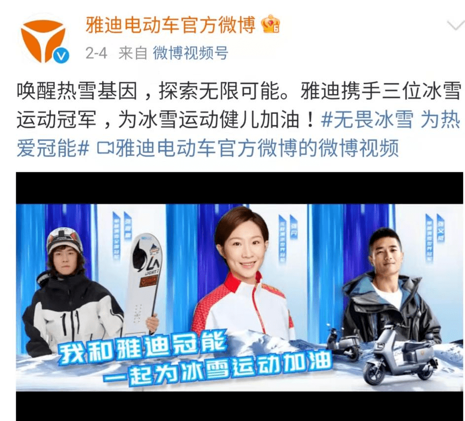 2月20日,一屆“真正無(wú)與倫比”的冰雪盛會(huì)正式落下帷幕。這屆充滿(mǎn)熱愛(ài)與拼搏的盛會(huì),不僅吸引了全世界的眼光,更是各大品牌營(yíng)銷(xiāo)借勢(shì)的大舞臺(tái)。與諸多頭部品牌借助運(yùn)動(dòng)員和奪金時(shí)刻的熱度,獲得品牌高頻次、大范圍的曝光不同,雅迪電動(dòng)車(chē)在此次營(yíng)銷(xiāo)活動(dòng)中,堅(jiān)守“以用戶(hù)為中心”的品牌初心,深度挖掘冰雪運(yùn)動(dòng)冠軍張丹、張義威、張嘉豪等通過(guò)拼搏最終奪冠的冠軍故事,觸達(dá)用戶(hù)內(nèi)心的力量,激勵(lì)用戶(hù)不忘初心,勇敢逐夢(mèng),為熱愛(ài)之程冠能。