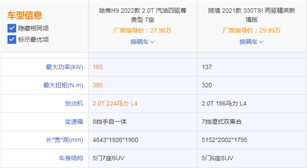 在城市SUV的主力軍當(dāng)中,攬境就是兼具了輕度越野的車型,但從動力方面來看,它與哈弗H9-2022款就相差許多,同樣搭載的都是2.0T的發(fā)動機(jī),但攬境的最大輸出功率僅為137kW,峰值扭矩可達(dá)320N·m,從這組數(shù)據(jù)就不難看出,攬境的動力實在與其價格不成正比了,未免有點偷工減料的嫌疑。
