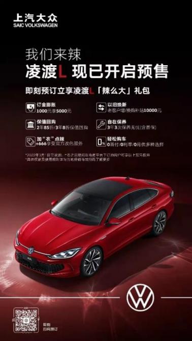 轎車方面,上汽大眾凌渡L、新朗逸同步煥新,并將陸續(xù)投放市場。辣感美學數(shù)字轎跑凌渡L以創(chuàng)新變革之姿重塑運動基因,以數(shù)字科技打造潮酷時尚空間,為追求個性的Z時代青年帶來潮流先鋒之選。上汽大眾凌渡L已于3月1日開啟預售,下訂即可享受“辣么大”禮包(包含訂金膨脹、以舊換新、保值回購、自在保養(yǎng)、加“衣”點辣、輕松購車等多重禮遇)。
