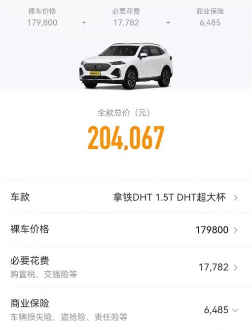 而拿鐵DHT,其售價(jià)在15.98-17.98萬(wàn)之間,這個(gè)售價(jià)也是相當(dāng)能打了。還是按照超大杯來(lái)計(jì)算,懂車帝給出裸車價(jià)為17.98萬(wàn),必要花費(fèi)為17782元,商業(yè)保險(xiǎn)為6485元,落地價(jià)約20.4萬(wàn)元。此外,這款車型基于其全自研智能DHT動(dòng)力架構(gòu),車主認(rèn)證百公里油耗大概在4.8L,可加92#汽油,保養(yǎng)費(fèi)用部分還有諸多優(yōu)惠,因此整體質(zhì)價(jià)比要比沃爾沃S60高出許多。