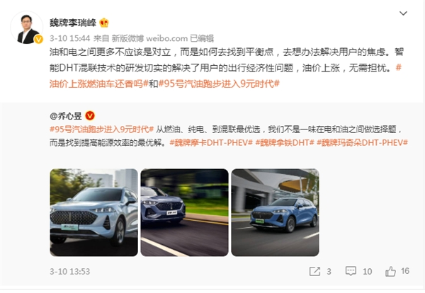在這個(gè)充滿機(jī)遇與未知的轉(zhuǎn)折點(diǎn),有車企利用信息差把講故事、打情懷牌當(dāng)成營(yíng)銷手段,吸引大批用戶,但也有魏牌這樣真正致力于解決用戶的焦慮,魏牌CEO李瑞峰現(xiàn)身微博,解答消費(fèi)者切身關(guān)心的問(wèn)題,例如續(xù)航減半、油價(jià)上漲等焦點(diǎn)問(wèn)題,充分展現(xiàn)了魏牌的態(tài)度,同時(shí)也是對(duì)自身技術(shù)的自信。