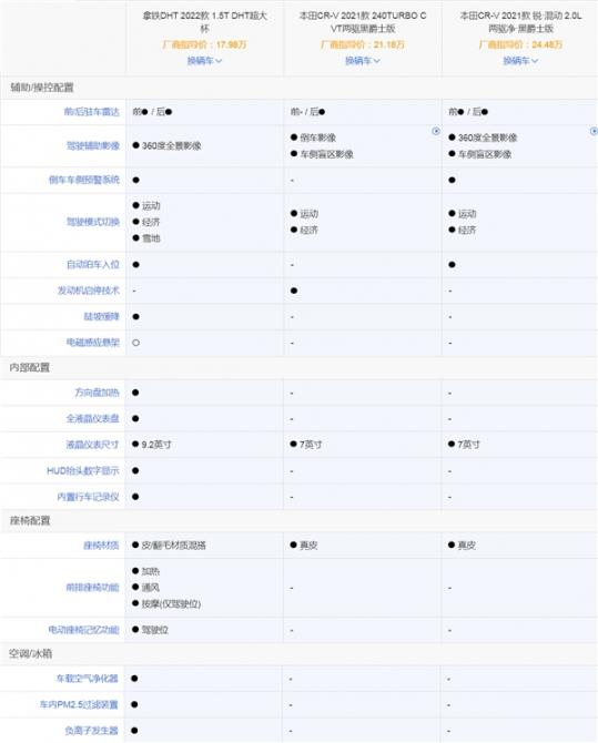 具體一些,我們就與雙田混動(dòng)之一的本田CR-V,以及其銳·混動(dòng)款車型對(duì)比。如圖所示,比對(duì)三款車型兩驅(qū)頂配,最先讓人印象深刻的就是三款車型售價(jià),各自相差幾乎都在2萬(wàn)元之間,然而拿鐵DHT與最貴的CR-V銳·混動(dòng)才是真正意義上的競(jìng)品,而CR-V作為合資燃油車,其高油耗特點(diǎn)是注定了無(wú)法與拿鐵DHT相對(duì)抗。