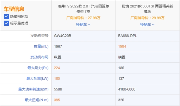 而作為同級車型的大眾攬境來說,搭載的就是EA888-DPL發(fā)動(dòng)機(jī),而且這款車型搭載的還是低功率版2.0升渦輪增壓發(fā)動(dòng)機(jī),只有186馬力,最大扭矩320N·m,其最大功率轉(zhuǎn)速為4100到6000轉(zhuǎn)每分鐘,最大扭矩轉(zhuǎn)速為1500到4000轉(zhuǎn)每分鐘。該發(fā)動(dòng)機(jī)采用的是混合噴射技術(shù),雖然也可以提高發(fā)動(dòng)機(jī)的工作效率,避免直噴發(fā)動(dòng)機(jī)在低負(fù)荷工況下因氧氣過量導(dǎo)致的排放問題。但整體表現(xiàn)與哈弗H9-2022款還是相差甚遠(yuǎn)的。