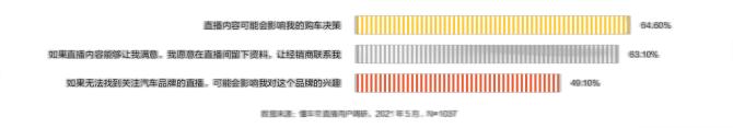 當下,直播正在對中國消費者的購車決策產(chǎn)生潛移默化的影響。據(jù)懂車帝的一項調(diào)查顯示,65%的受訪者表示他們感興趣品牌的直播可能會影響到他們的購買決策;63%的受訪者表示會因為讓他們滿意的直播內(nèi)容而留下線索;此外,也有將近半數(shù)的受訪者表示他們在購車前也會去直播間看一看相應的內(nèi)容。直播內(nèi)容的豐富及專業(yè)程度,直接影響了潛在消費者的興趣。