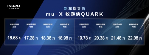 活動(dòng)當(dāng)天,消費(fèi)者翹首以盼的兩款汽油機(jī)新品也正式跟大家見(jiàn)面,由此吹響了江西五十鈴進(jìn)軍汽油車(chē)市場(chǎng)的號(hào)角。兩款車(chē)型均配備業(yè)界領(lǐng)先的2.0T汽油超強(qiáng)動(dòng)力、搭載豪華車(chē)專屬采埃孚8AT自動(dòng)變速箱,其中,鈴?fù)谿ANK共推出8款車(chē)型,官方指導(dǎo)價(jià)13.68萬(wàn)-18.28萬(wàn)元。以獨(dú)家大空間全感官智能座艙等制霸越野圈的mu-X牧游俠QUARK,共推出8款車(chē)型,官方指導(dǎo)價(jià)16.68萬(wàn)-22.08萬(wàn)元。