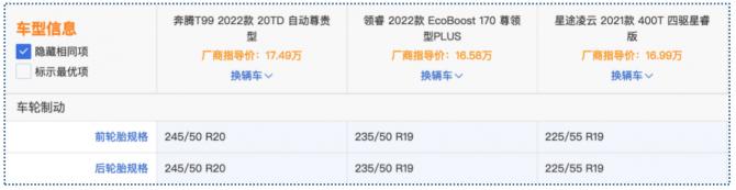 如果以16萬左右的價格作為預算買SUV,放在從前,市面主流產量都集中在緊湊型的級別,但近幾年隨著競爭越來越激烈,不少打破級別局限的中型SUV將價格下探,以更龐大的體型更高的品質,形成“降維打擊”,無疑,對于追求“大車”的消費者來說相當友好。今天我們就對比三款中型SUV奔騰T99 20TD 自動尊享型、福特領睿EcoBoost 170尊領型PLUS、星途凌云400T四驅星瑞版,看看在16萬左右(經銷商參考價)的價格,怎么買質價比最高。