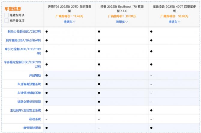 配置是否豐富,可以說是當下用戶購車最為關注的地方,三款車的基礎配置都是足夠的,差異主要集中在更高階的配置上。其中,奔騰T99和福特領睿最全面,時下主流的配置基本都有包含。