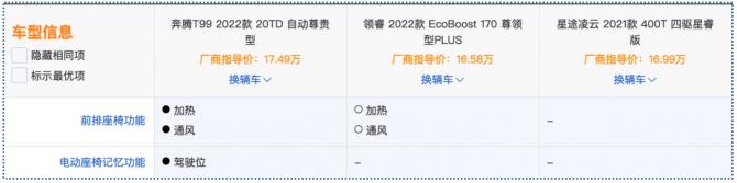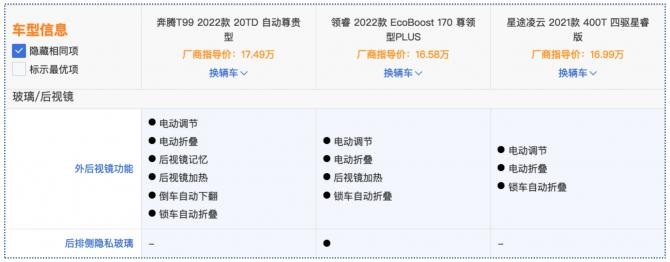其次,在細節(jié)配置上,奔騰T99的外后視鏡支持電動調節(jié)、折疊、記憶等,還可以加熱,雨天或是冬季,可讓行車視線免受干擾;福特領睿是三款車中唯一具備后排隱私玻璃的車型。