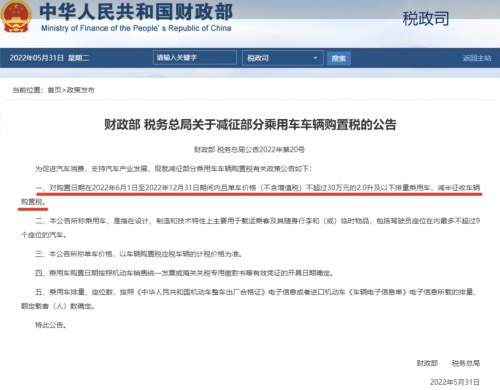 期待多日的減征部分乘用車購置稅600億大禮包正式落地,2022年6月1日-2022年12月31日期間,購買單車價格( 不含增值稅)不超過 30 萬元的2.0升及以下排量乘用車,減半征收車輛購置稅。