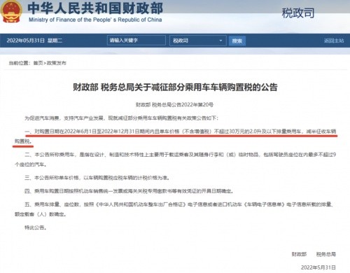 5月31日,財政部發(fā)布《關(guān)于減征部分乘用車車輛購置稅的公告》。公告內(nèi)容顯示,為促進(jìn)汽車消費,支持汽車產(chǎn)業(yè)發(fā)展,對購置日期在2022年6月1日至2022年12月31日期間內(nèi)且單車價格(不含增值稅)不超過30萬元的2.0升及以下排量乘用車,減半征收車輛購置稅。