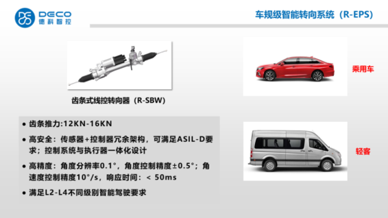德科智控,作為國內(nèi)領(lǐng)先的智能駕駛轉(zhuǎn)向產(chǎn)品供應(yīng)商,專注于線控底盤技術(shù),特別是線控轉(zhuǎn)向技術(shù)的研發(fā)和量產(chǎn)。通過20年的研發(fā)及量產(chǎn)經(jīng)驗(yàn),形成了滿足“全場景、全車系、全冗余”的線控技術(shù)。自主研發(fā)線控轉(zhuǎn)向的三大核心技術(shù),包括扭角一體式傳感器(TAS)、ECU及無刷電機(jī)。同時(shí)擁有L2-L4級線控智能硬件平臺和L4級車輛智能駕駛線控冗余算法。