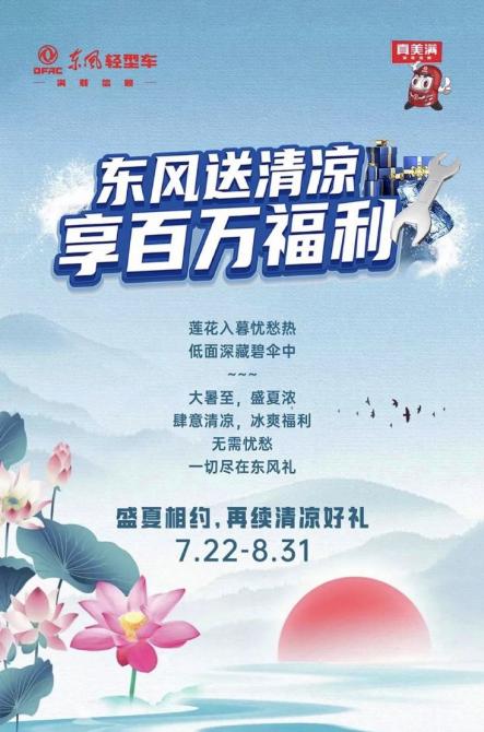 東風(fēng)輕型車始終秉承著“向客戶而生”的企業(yè)理念,“關(guān)懷每一個人,關(guān)愛每一部車”,讓每一位用戶感受到“真美滿”。大暑至,盛夏濃,東風(fēng)輕型車夏日專“暑”福利,時刻為你守候。