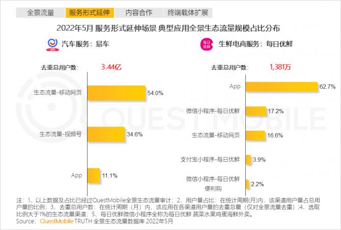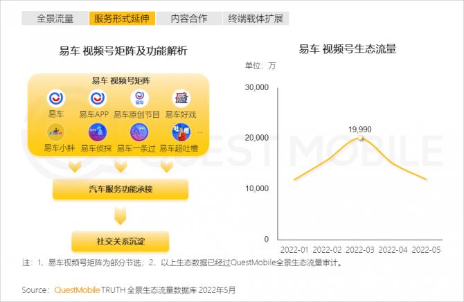 無獨(dú)有偶,近期QM發(fā)布的《QuestMobile2022全景生態(tài)流量半年報(bào)告》也體現(xiàn)了易車在用戶爭(zhēng)奪戰(zhàn)中的優(yōu)勢(shì)地位。該報(bào)告顯示,易車基于用戶使用特點(diǎn),將服務(wù)融入多種形式滿足用戶多元使用場(chǎng)景,2022年5月,在包括移動(dòng)網(wǎng)頁、視頻號(hào)和App在內(nèi)的全景生態(tài)流量去重總用戶達(dá)到3.44億。其中易車打造視頻號(hào)矩陣,以短視頻內(nèi)容引流,配套服務(wù)承接及社交功能,在微信視頻號(hào)收獲近2億流量。