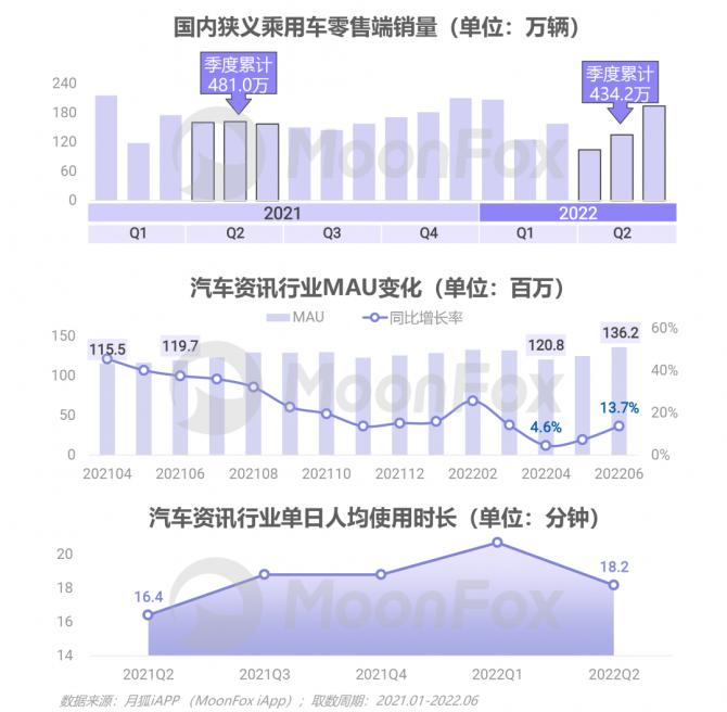 7月26日,知名移動(dòng)大數(shù)據(jù)服務(wù)商極光大數(shù)據(jù)發(fā)布《2022年Q2移動(dòng)互聯(lián)網(wǎng)行業(yè)數(shù)據(jù)研究報(bào)告》(以下簡(jiǎn)稱“報(bào)告”)。報(bào)告顯示,隨著車企復(fù)工復(fù)產(chǎn)以及購置稅減半等利好政策的出臺(tái),供需兩端同步提振市場(chǎng)信心,汽車銷量節(jié)節(jié)攀升,車市顯著回暖。同時(shí),汽車資訊行業(yè)MAU在經(jīng)歷了季初的回落后,重新恢復(fù)上行,6月MAU上漲至1.36億,同比增長(zhǎng)率回升至10%以上,行業(yè)月活用戶規(guī)模保持穩(wěn)定的正增長(zhǎng)態(tài)勢(shì)。