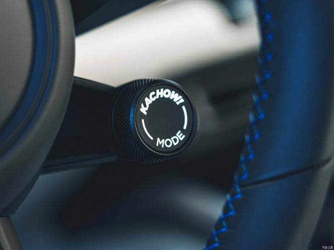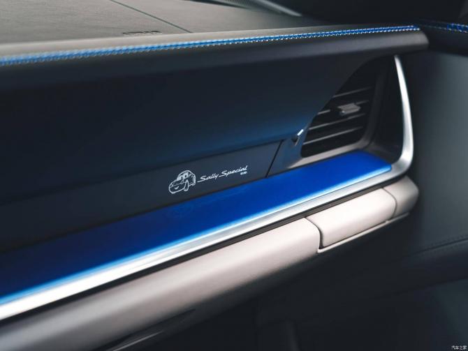 進到車內,新車同樣使用了專屬Sally Blue Metallic配色,座椅以及門內飾板采用全新的三色千鳥格圖案,在副駕駛前方還印有莎莉的畫像和Sally Special專屬編號。細節(jié)方面,該車的駕駛模式選擇按鈕將顯示劇中經典臺詞“Kachow!”