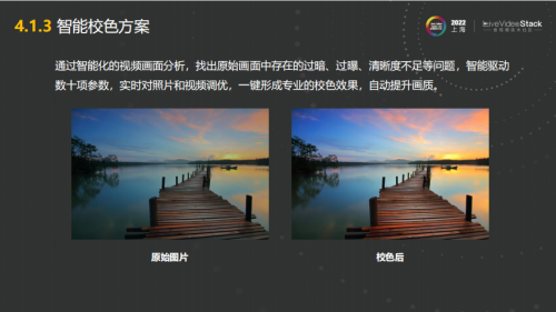 隨后,他分享了美攝研發(fā)團(tuán)隊在傳統(tǒng)方案基礎(chǔ)上研發(fā)的智能校色方案。方案首先對原始圖片的畫面像素進(jìn)行統(tǒng)計得到統(tǒng)計值并對其進(jìn)行處理,通過算法得到十幾項基本的調(diào)色參數(shù)(如亮度、曝光度、對比度、自然飽和度等),最后通過調(diào)節(jié)這些參數(shù)得到畫質(zhì)較好的圖片。此外,他們還開發(fā)了一種清晰度算法來增強畫面的局部色塊、特征,結(jié)合邊緣細(xì)節(jié)的增強可得到一個較柔和的增強后的畫面。
