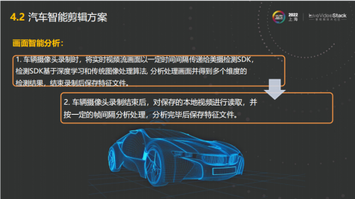 接下來是方案核心內(nèi)容——汽車智能剪輯方案,這是目前美攝科技主推的一套方案,在一些大廠已經(jīng)落地。智能剪輯方案的大致思路是對采集到的視頻畫面進(jìn)行多維度分析,根據(jù)分析結(jié)果將視頻結(jié)構(gòu)化,并為每一段打上標(biāo)簽,得到對于視頻的立體的理解。再根據(jù)客戶的要求,如定制的拍攝主題、拍攝思路等,定制檢測和匹配的規(guī)則,最終生成包裝完成的視頻。