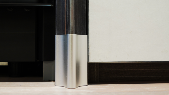 「云墨」茶室收納墻邊沿選用鑲嵌金屬裝飾條,兩端對(duì)稱的金屬材質(zhì),將金絲黑檀圍在中間,仿佛一幅卷起來的國畫立軸,傳統(tǒng)文化氛圍瞬間拉滿。