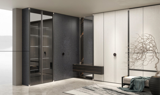 「云墨」入戶玄關(guān)柜體與護(hù)墻連接,在透明鏡柜及超高穿衣鏡的裝飾下,加強(qiáng)入戶空間的延伸感,轉(zhuǎn)角穿插換鞋凳設(shè)計(jì),滿足家居主人儀容整理、掛衣、儲(chǔ)物等多種功能。