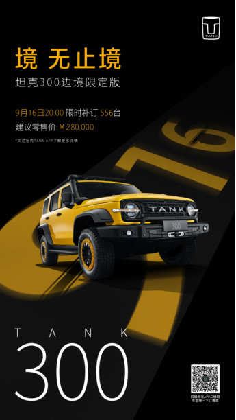 為積極響應(yīng)用戶(hù)需求、回應(yīng)客戶(hù)期待,坦克300邊境限定版將于9月16日20:00開(kāi)啟補(bǔ)訂。邊境限定版于今年6月24日上市,上市6分鐘內(nèi)首批限量3000臺(tái)被搶購(gòu)一空。由于出現(xiàn)用戶(hù)搶購(gòu)成功后未支付以及個(gè)人原因退訂等情況,在上市至今等待過(guò)程中,共計(jì)產(chǎn)生856筆退訂及無(wú)效訂單。此次坦克品牌將在坦克TANK APP上開(kāi)啟補(bǔ)訂通道,為消費(fèi)者們提供556臺(tái)邊境限定版的補(bǔ)訂機(jī)會(huì),剩余300臺(tái)將用于坦克團(tuán)專(zhuān)場(chǎng)內(nèi)購(gòu)活動(dòng)。