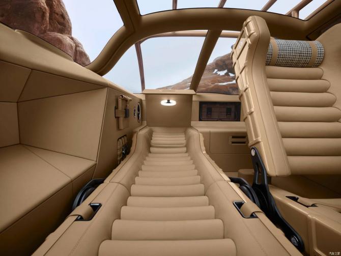 內飾同樣獨具匠心,采用了雙座設計,主副駕駛座椅采用了一體式設計,頭部左右兩側提供了巨大的包裹,保證車輛在越野時保護駕駛者頭部。同時還能徹底放平形成兩個類似頭等艙的零時床鋪,并大量采用真皮材質包裹,凸顯其品牌應有的豪華感。