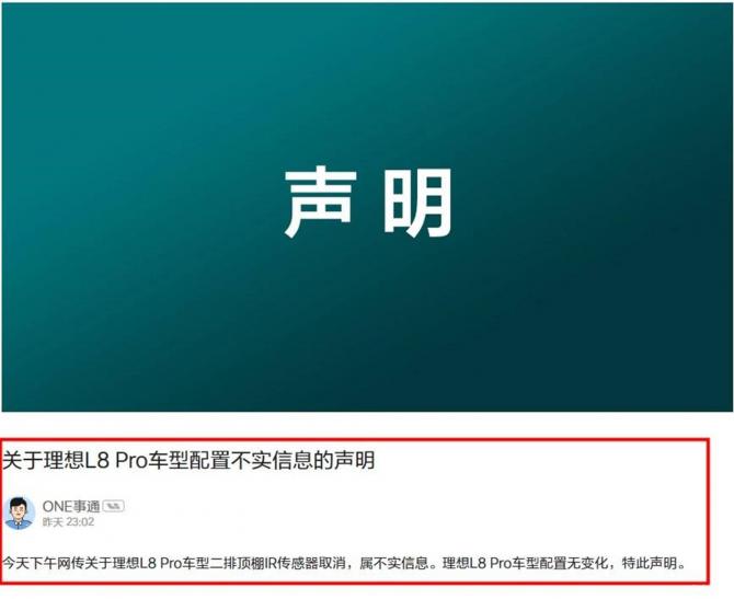 隨后,理想官方就在理想社區(qū)發(fā)布了相關(guān)聲明,表示:“網(wǎng)傳關(guān)于理想L8 Pro車型二排頂棚IR傳感器取消,屬不實信息。理想L8 Pro車型配置無變化,特此聲明?!?br/>