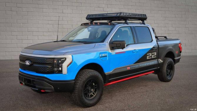 F-150 Lightning改裝車同樣有兩款,其中一款采用低趴風(fēng)格,加裝了太陽能充電器、便攜式空氣壓縮機(jī)和冰箱等。另外一臺(tái)則是按照越野比賽保障車的風(fēng)格進(jìn)行升級(jí),其配備空氣壓縮機(jī),防滑板、工具箱以及備胎等等。
