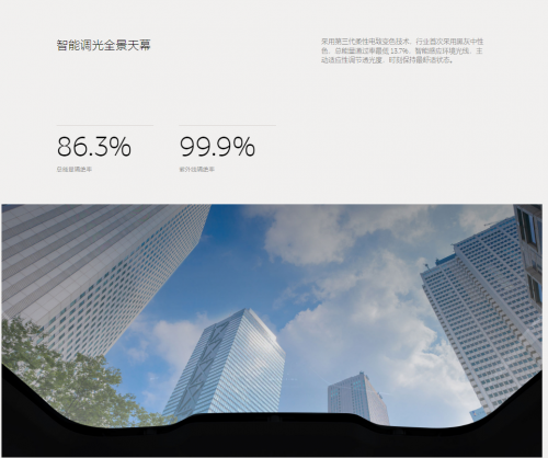 EC7搭載的智能調光天幕,是電致變色技術領域的一項重大技術突破,從1000多種分子結構中探索出的全新材料,實現了對380納米到750納米整個可見光波段全光譜的均勻吸收和變化,通過反復調試得到了最終產品。在外觀上呈現黑灰高級質感。同時具備出色的防曬、隔熱、防眩目性能,車內光線始終柔和,視野始終清晰,全方位為用戶提供完美的駕乘體驗。