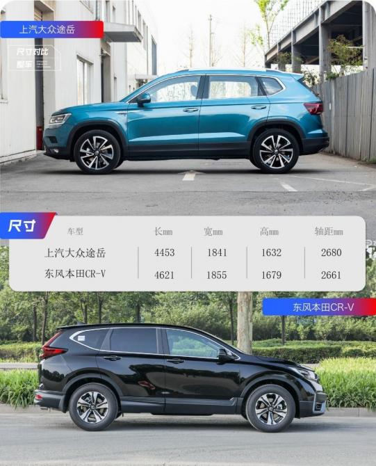 尺寸上,途岳的長寬高分別為4453/1841/1632mm,CR-V的長寬高分別為4621/1855/1679mm,顯然在數(shù)據(jù)上表現(xiàn)出色的CR-V,在視覺上敗給了看起來尺寸更大的途岳。軸距表現(xiàn)途岳再次憑借2680mm戰(zhàn)勝CR-V的2661mm軸距表現(xiàn)。