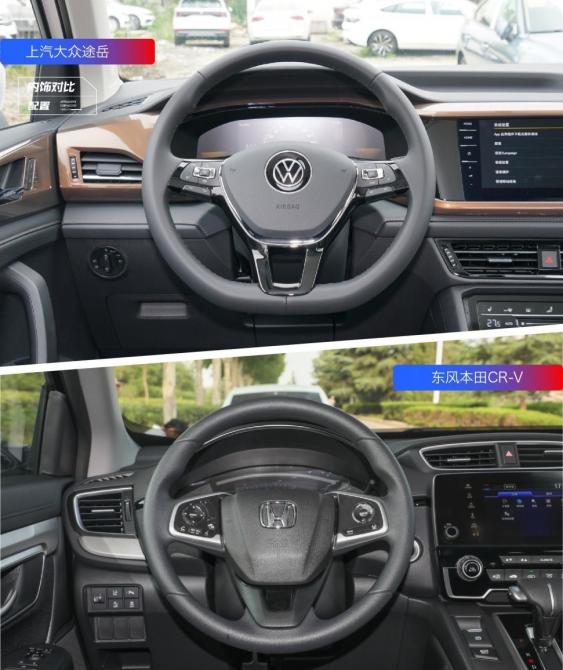 盡管兩款車都采用三輻式多功能方向盤,途岳選擇了平底樣式,比CR-V更顯運(yùn)動年輕。此外,途岳比CR-V更加在意對科技感和整體質(zhì)感的營造。例如途岳真皮方向盤帶來的高級手感,就是CR-V塑料材料無法比擬的,而且多功能按鍵的質(zhì)感也遠(yuǎn)不如途岳。相對來看,途岳的多功能按鍵更加扁平,布局雖然緊湊手指卻可以很順滑的切換。