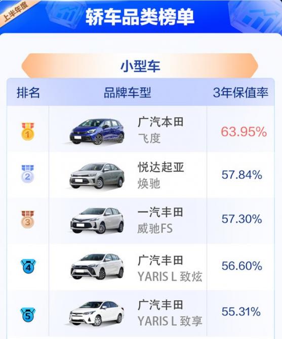 具體來看,小型車榜單中,飛度再次鎖定同級別第一名位置,保值率超過63%。除了飛度外,煥馳以57.84%的保值率躍升第二,威馳家族基于性價比優(yōu)勢,受關注度較高,且經(jīng)過市場檢驗,品質(zhì)出色、服務網(wǎng)點覆蓋率高,保值率為57.3%,相比去年整體排名下降一名。小型車市場雖然呈萎縮趨勢,但頭部車型變化不大,且三年保值率相對其他車型市場表現(xiàn)出了很強的穩(wěn)定性。