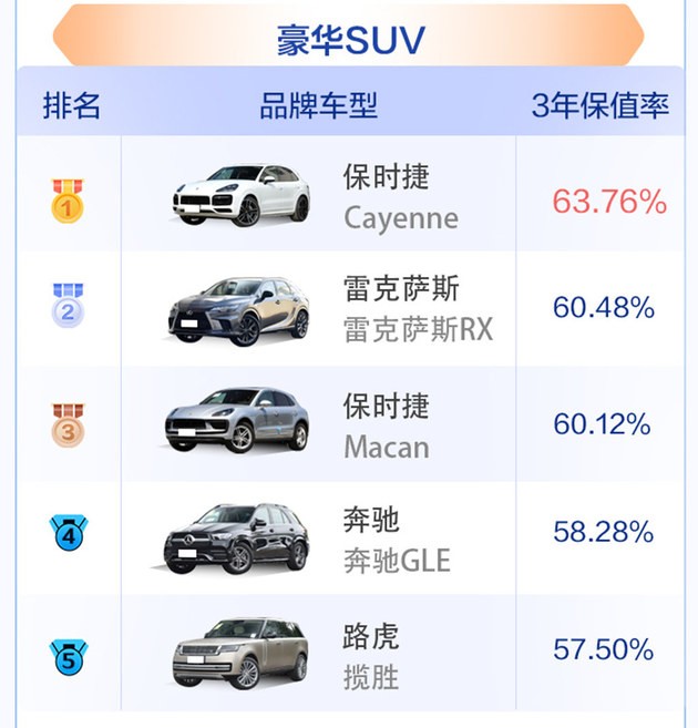 保時捷的豪華地位加較強的品牌溢價能力,拉高了旗下產(chǎn)品的保值率,Cayenne和Macan分別位于榜單的第一、三名;雷克薩斯RX回歸榜單,以60.48%的保值率拿到亞軍。豪華SUV市場的整體保值率水平較高,但近半年波動也更大,受新車端優(yōu)惠政策影響,部分產(chǎn)品保值率下滑明顯。