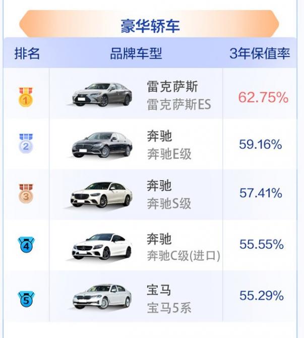 豪華轎車市場的整體排名變化不大,但整體保值率水平下降較多,主要是在新車市場上,其價格也出現(xiàn)了明顯松動;雷克薩斯ES保值率依舊領先,62.75%的保值率數(shù)據(jù)相比2022年68.08%下降明顯,這也與終端銷售價格松動有一定關系。除此之外,上榜的奔馳3款車型和寶馬1款車型,三年保值率均已跌破60%。