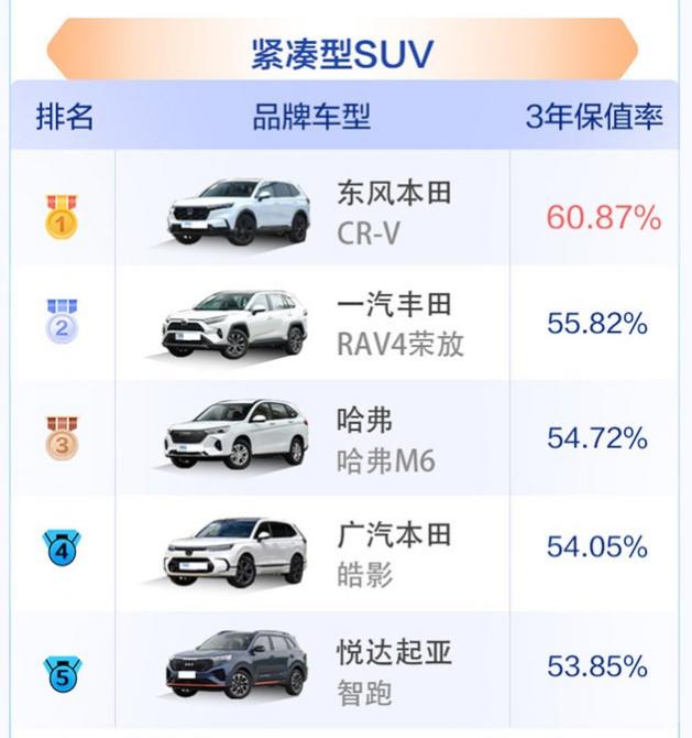 緊湊級SUV市場中出現(xiàn)了黑馬哈弗M6,在整體保值率下降趨勢下,其保值率相比2022年,上漲了超過10%,成為榜單第三。東風本田CR-V以絕對優(yōu)勢鎮(zhèn)守第一名,也是榜上唯一拿到60%以上成績的車型,成績?yōu)?0.87%