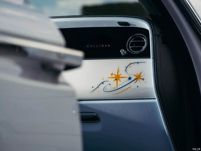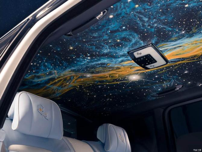 據(jù)悉,該車(chē)頂是由勞斯萊斯內(nèi)部的藝術(shù)家手繪而來(lái),創(chuàng)作時(shí)間超過(guò)160多個(gè)小時(shí)。除了車(chē)頂之外,車(chē)內(nèi)還采用Charles Blue(藍(lán))與Grace White(白)真皮座椅搭配,座椅上還擁有撞色縫線,營(yíng)造出強(qiáng)烈的視覺(jué)沖擊力。當(dāng)然,作為全球僅此一臺(tái)的產(chǎn)品,在門(mén)檻處我們也能夠看到“Cullinan Cosmos One of One”標(biāo)識(shí),并且包括門(mén)板以及頭枕等處還擁有專(zhuān)屬“星團(tuán)圖案”標(biāo)識(shí)。