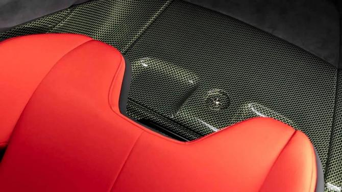 內(nèi)飾延續(xù)經(jīng)典與現(xiàn)代的融合思路,腳踏區(qū)、座椅靠背、儀表臺(tái)及方向盤裝飾件均采用碳-凱夫拉復(fù)合材料,這種曾助力F40實(shí)現(xiàn)極致輕量化的材質(zhì),如今以更先進(jìn)工藝重現(xiàn)江湖。座椅采用紅色提花織物與黑色Alcantara材質(zhì)拼接,還原了F40簡(jiǎn)約絨面儀表板的運(yùn)動(dòng)風(fēng)格,在細(xì)節(jié)處呼應(yīng)復(fù)古主題。