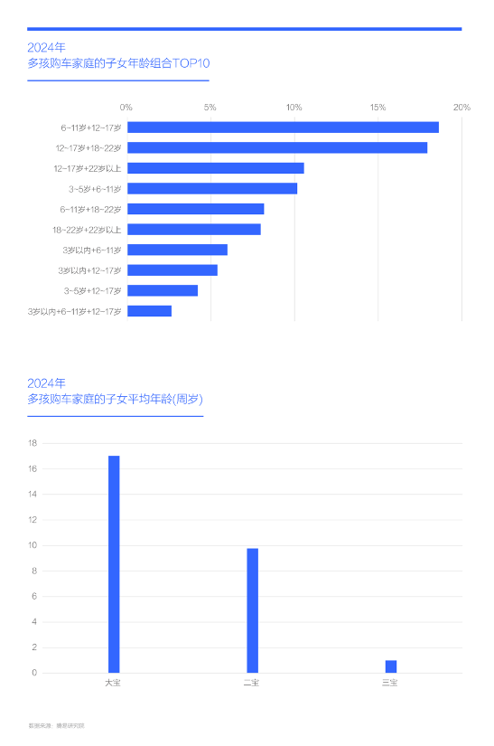 2024年,多孩購車家庭的子女年齡組合以6~11歲+12~17歲和12~17歲+18~22歲為主,大寶平均17.01歲、二寶9.77歲、三寶1歲
