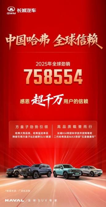 2025年,哈弗品牌在競(jìng)爭(zhēng)激烈的汽車市場(chǎng)中,交出了一份扎實(shí)的成績(jī)單:2025年全球勁銷758554輛,同比增長(zhǎng)7.41%。更值得關(guān)注的是,其全球累計(jì)用戶在2025年正式突破1000萬(wàn)大關(guān)。