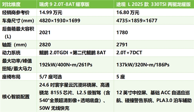 在15萬(wàn)元預(yù)算范圍內(nèi)選購(gòu)一輛稱心如意的燃油SUV,確實(shí)是許多消費(fèi)者面臨的現(xiàn)實(shí)難題。今天我們將通過(guò)詳實(shí)的對(duì)比測(cè)試,為您解析兩款熱門(mén)車(chē)型——奇瑞瑞虎9耀享版與大眾途觀L 兩驅(qū)龍耀版的實(shí)際表現(xiàn)。這兩款車(chē)都在15萬(wàn)以內(nèi)的價(jià)格區(qū)間內(nèi),但產(chǎn)品力卻存在著差異,希望通過(guò)本次全方位對(duì)比,能為您的購(gòu)車(chē)決策提供有力參考。