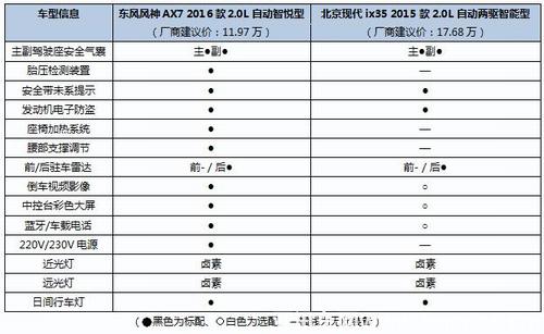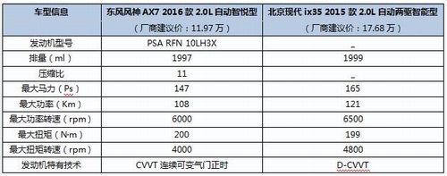 由于車型的不同,動(dòng)力上小編均選取兩款車中的兩驅(qū)高配車進(jìn)行對(duì)比分析——東風(fēng)風(fēng)神AX7的 2.0L自動(dòng)智悅型、北京現(xiàn)代ix35,2.0L自動(dòng)GLS。