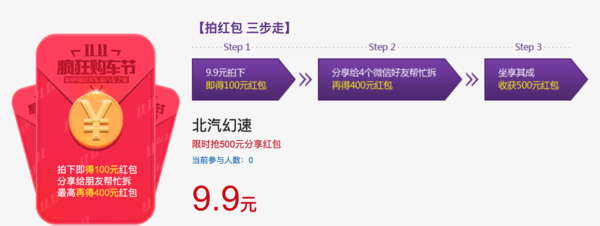 雙十一大促怎么可能少得了秒殺呢!別人是秒殺吃的喝的,我們秒殺紅包!?。?1月1日-11日,用戶在汽車之家車商城北汽幻速品牌專區(qū)支付1元,即有機會拍得5000元大額紅包(20個大額紅包分20場秒殺)線下提車出示,驗券后抵扣車款。調(diào)好鬧鐘,時刻準備著出手吧!