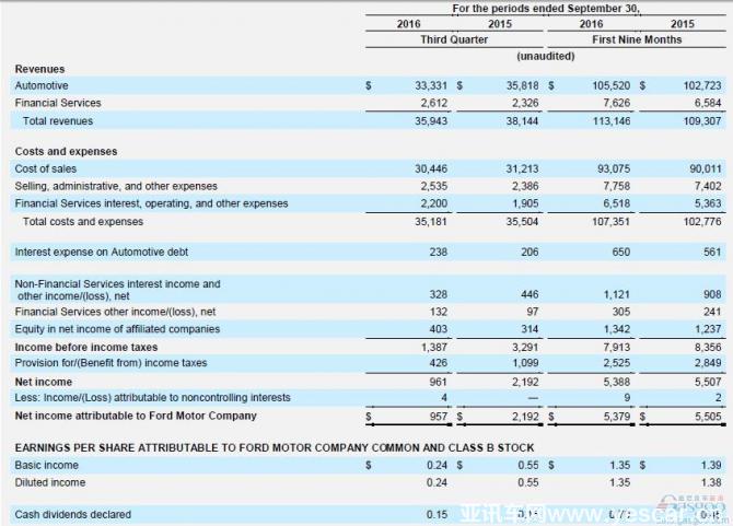 2016年第三季度,福特汽車營業(yè)收入333.31億美元,去年第三季度營收358.18億美元,同比下滑6.9%。2016年前三季度福特營業(yè)收入1055.2億美元,較之去年同期的1027.23億美元,同比微增2.7%。今年第三季度福特金融服務(wù)收入創(chuàng)2011年以來季度新高,從去年第三季度的23.06億攀升12.3%至26.12億美元。