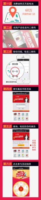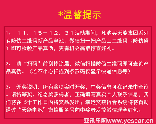 11月15日—12月31日,凡是購買帶有最新防偽碼的天能集團(tuán)旗下任意電池(包括天能電池、匯源電池等不同品牌,鉛酸、鋰電等不同材料,自行車、三輪車、汽車等不同適用產(chǎn)品),即可開箱掃碼,輸入身份信息查詢電池真?zhèn)?,并可獲得一次抽獎機(jī)會,豪華大禮等你來搶!