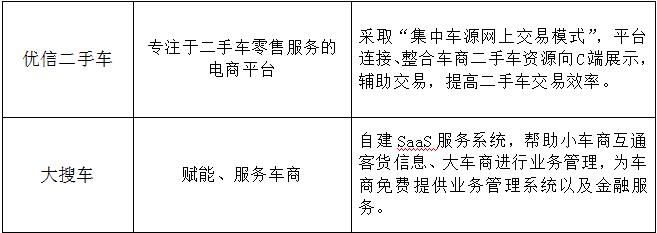 優(yōu)信二手車和大搜車的二手車零售領(lǐng)域布局,盡管都以服務(wù)車商為主,但模式也不盡相同: