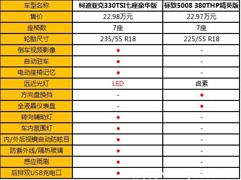文中我們對比的價(jià)格相當(dāng)?shù)膬煽?座車型,從標(biāo)致5008 7座精英版車型的配置表來看,整體配置水平處于同級車型主流水平,各項(xiàng)舒適性、安全性配置該有的都有了。但如果和柯迪亞克330TSI七座豪華版相比,配置上的差距還是非常明顯的。