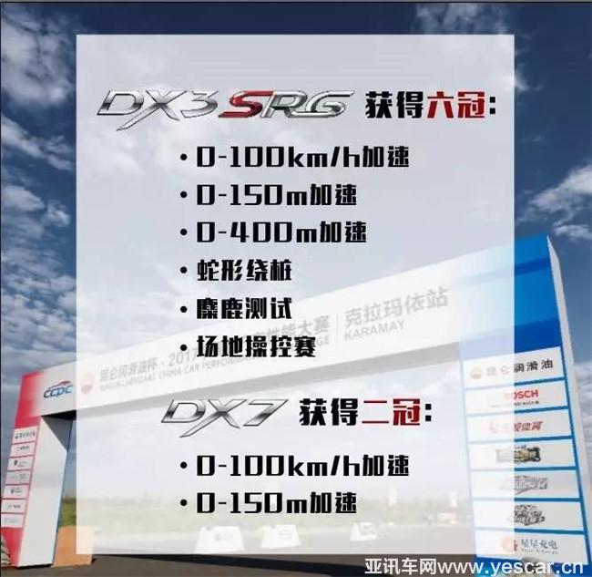 在今年的大賽中,去年參賽并奪冠的DX7攜手賽場(chǎng)新秀DX3 SRG共同逐鹿克拉瑪依,在為期三天的比賽中,DX7和DX3 SRG共斬獲八項(xiàng)冠軍,用優(yōu)異的成績(jī)和表現(xiàn),征服了高溫炙熱的魔鬼城,凱旋而歸。