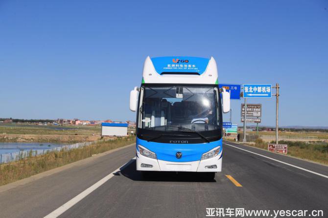 【福田歐輝8.5氫燃料電池客車行駛在張北草原,表現(xiàn)出卓越的動(dòng)力性和性能穩(wěn)定性】