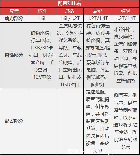 新車(chē)推出標(biāo)準(zhǔn)/舒適/豪華/旗艦4個(gè)等級(jí)的配置,以及1.6L/1.2T/1.4T三種動(dòng)力共7款車(chē)型。