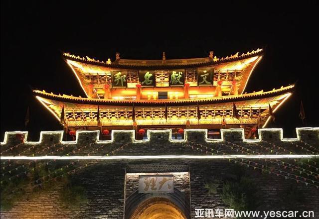 抵達(dá)大理之時,已經(jīng)夜幕降臨,開了景觀燈之后的大理城門顯得金光閃閃,文獻(xiàn)名邦的字格外耀眼。