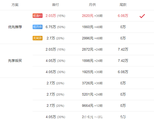 當(dāng)然如果你不想支付尾款也不想承受太高的月供,那么可以選擇“低月供”金融方案,首付50%、月供1900元左右、分48期歸還。這套方案對(duì)于手頭上資金充裕同時(shí)不喜歡月供壓力的朋友非常適合。